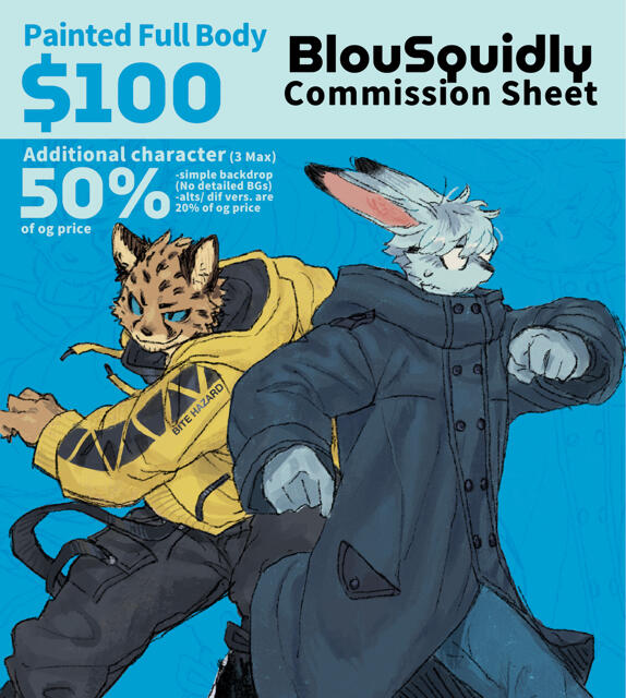 Experienced in anthropomorphic character work and concept art. I use Procreate & Clip Studio Paint EX to produce my work.